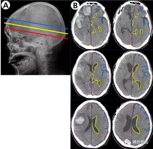 該研究收集作者所在單位2011年至2015年接受手術(shù)治療的自發(fā)性腦出血患者。研究對象的血腫位于幕上單側(cè)大腦半球;根據(jù)術(shù)前和術(shù)后3個月在頭顱CT軸位3個平面,即室間孔平面、透明隔平面和側(cè)腦室平面上的影像片(圖1)